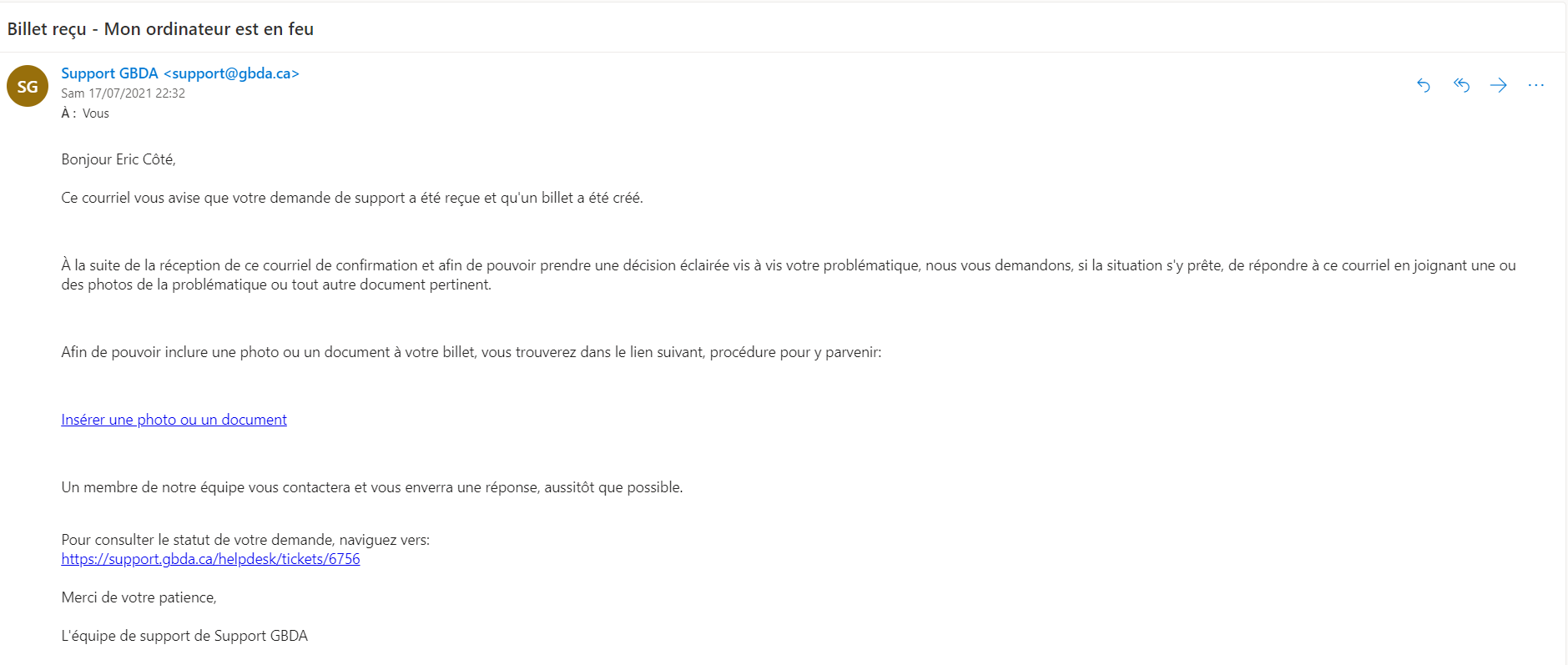 Lorsque vous soumettrez votre billet, l'équipe vous fera parvenir un courriel d'activation afin que vous puissiez être en mesure de faire le suivi de vos billets. Vous devrez procéder à l'activation de votre compte
