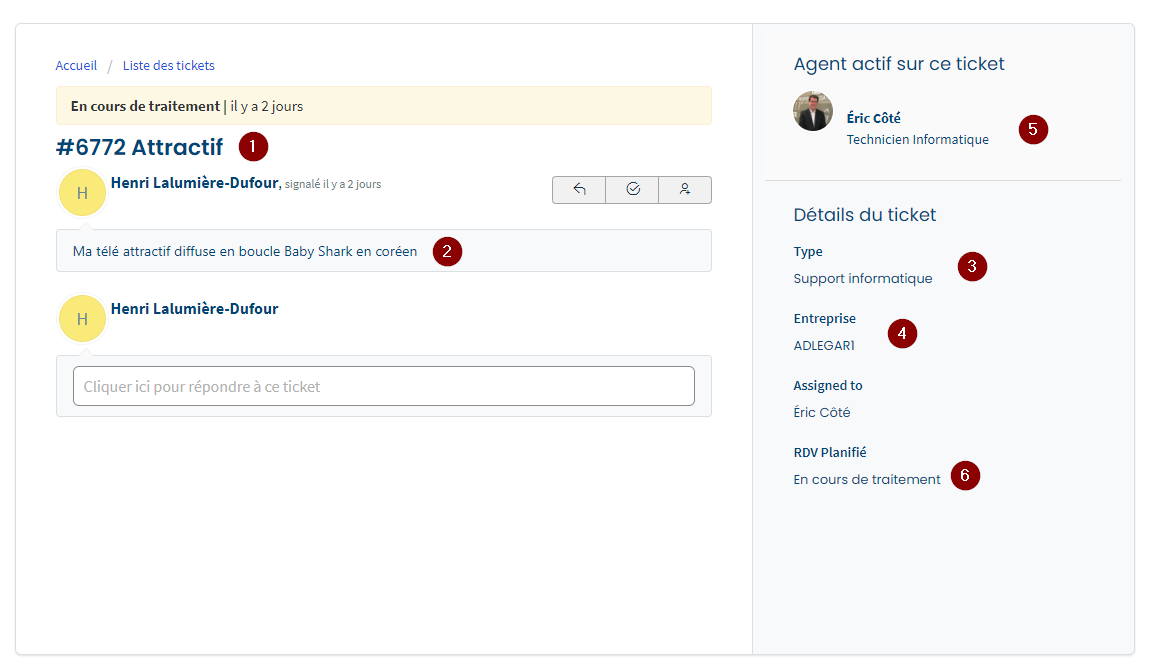 Lorsque vous voulez vérifier l'état d'avancement de votre requête, vous n'avez qu'à cliquer sur "vérifier le statut du ticket" et les informations requises sont accessibles à vous...le numéro du billet, le problème comme tel, l'agent attitré, le type de demande et l'état d'avancement.