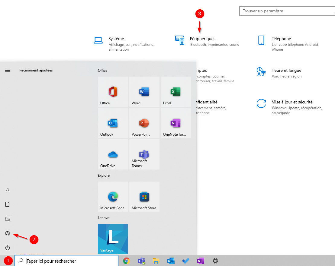 - Pour débuter, rendez-vous dans les paramètres Windows --> périphériques