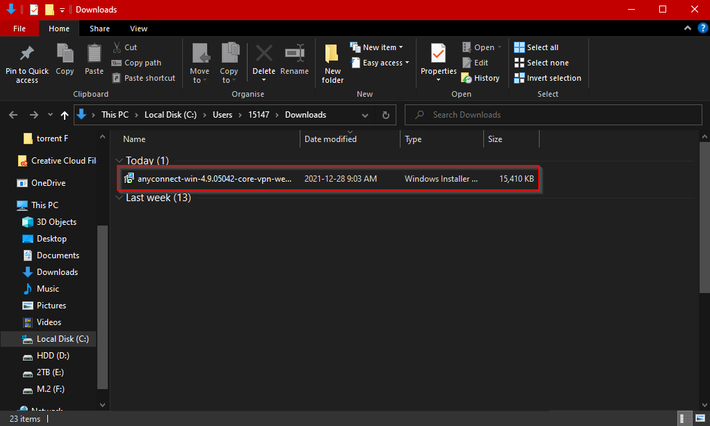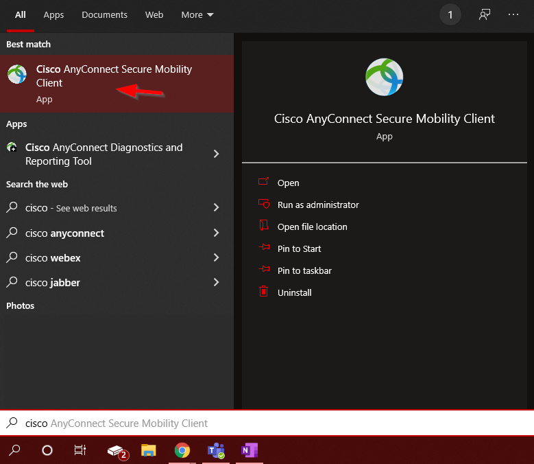 - Une fois installer, rechercher dans la barre de recherche Windows Cisco AnyConnect.