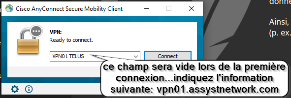 - Ensuite, entrez le nom du serveur VPN suivant : vpn01.assystnetwork.com