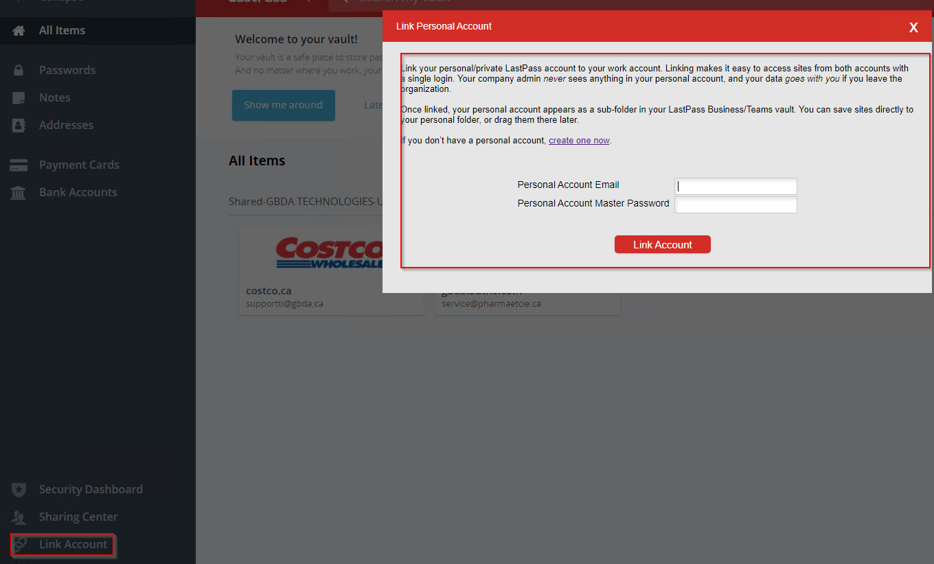 Si Vous avez un compte personnel vous pouvez le lier. De cette façon si vous emmagasinez des mots de passe personnels non reliés à la compagnie, vous pouvez les emmagasiner dans votre vout personnelle. Si vous quittez l’etreprise, vous restez avec votre voute personnelle. Celle-ci doit être cére avec une addresse autre que @gbda.ca