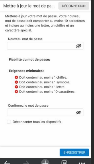 Vous devrez par ls suite valider un mot de passe afin d'accéder à la plate forme. Ce mot de passe est le même que vous utiliserez pour vous connecter à partir d'un ordinateur. Une question de sécurité vous sera demandée afin de valider votre identité dans le cas où vous auriez à vous identifier si vous égarez votre mot de passe