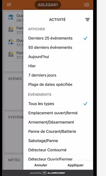 Le menu d'activité récente vous permet de voir les tous les événements ( mouvement, ouvertures etc... )