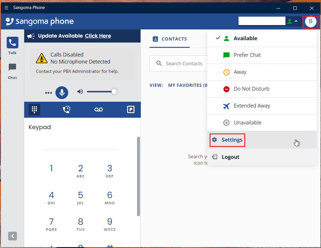 -Cliquez sur votre icône de votre profil en haut à droite de l'application Sangoma et cliquez sur "Settings" ou "Paramètres" ou "Réglages".
