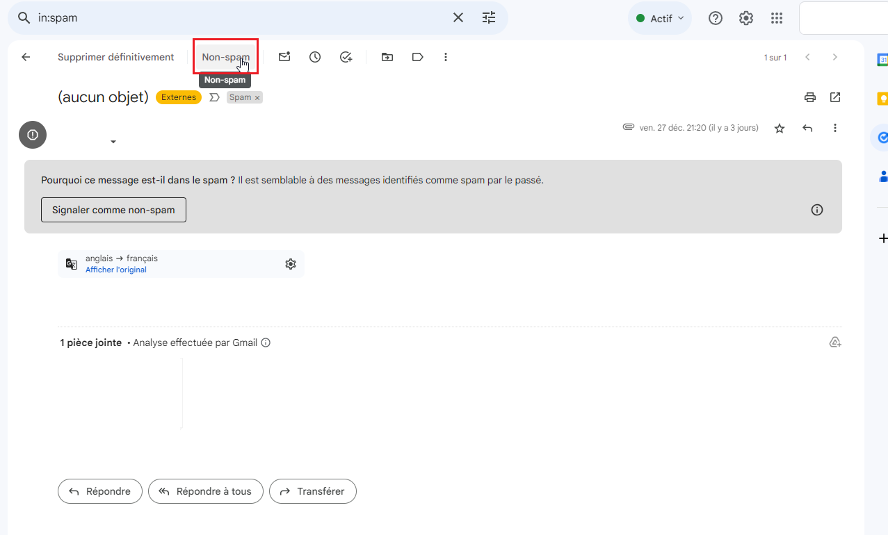 -Dans le dossier "spam" ou "courrier indésirable", ouvrez le courriel de l'expéditeur que vous voulez autoriser et cliquez sur "Non-spam".
