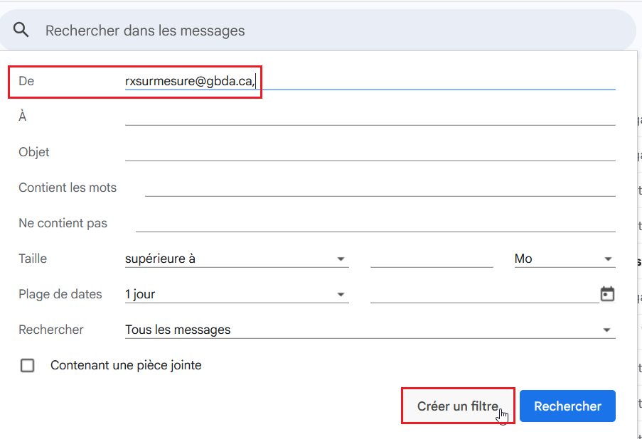 -Écrivez la ou les adresses courriels que vous souhaitez autoriser dans le champ "De" et cliquez sur "Créer un filtre"