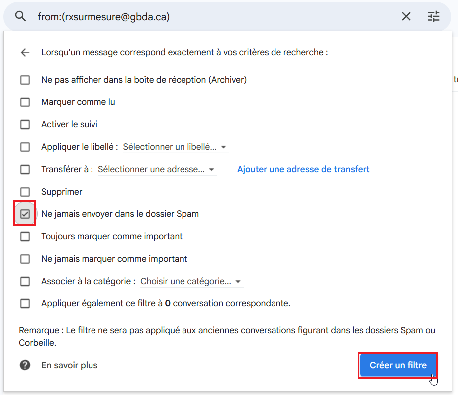 -Cochez la case "Ne jamais envoyer dans le dossier Spam" et cliquez sur "Créer un filtre"