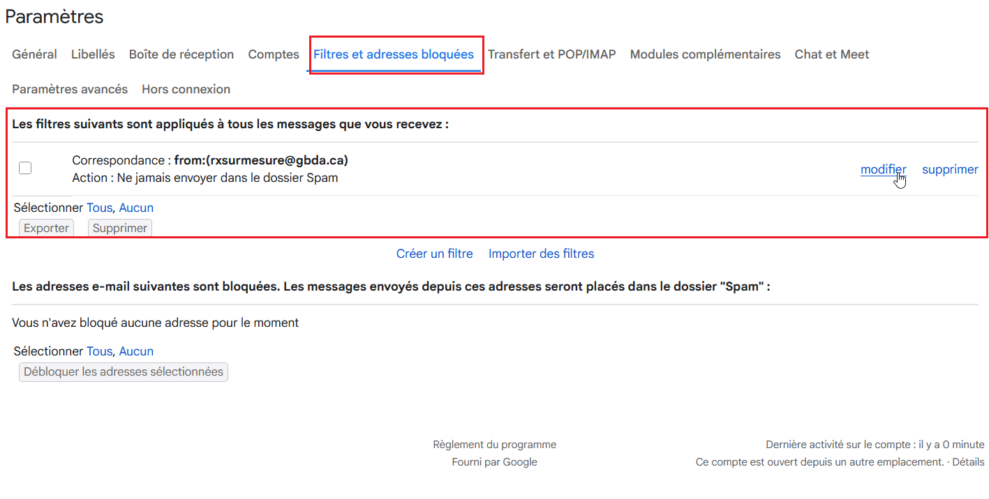 -Vous verrez vos filtres dans la section "Filtres et adresses bloquées"